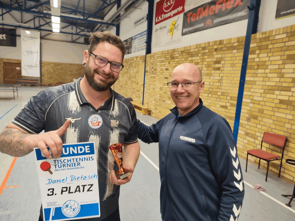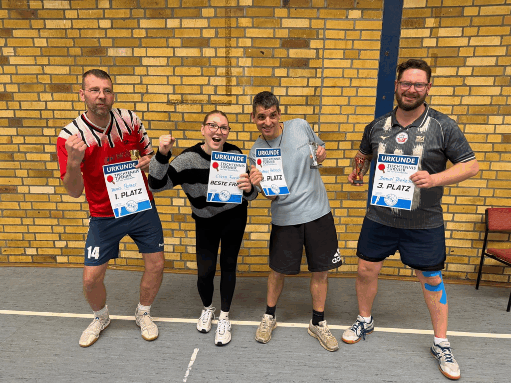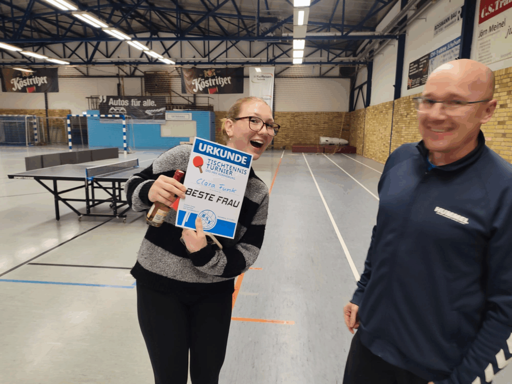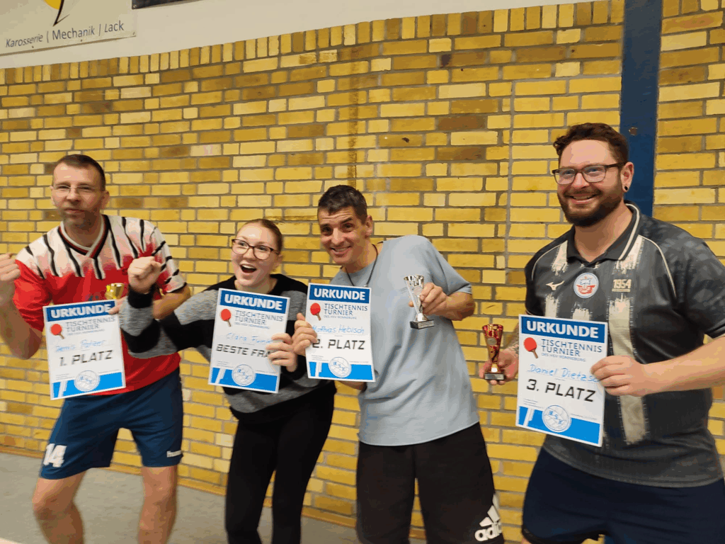 In der KO-Runde gab es dann richtig spannende Spiele zu sehen. Die Ballwechsel wurden immer länger und die Begeisterung immer größer. Berits im Achtelfinal gab es entscheidende Spiele, wie Denis gegen Rico. Auch im Viertelfinale blieb die Spannung hoch, als Clara knapp gegen Daniel mit 2:3 Sätzen ausscheiden musste. Auch im Halbfinale war das Spiel zwischen Schnorks und Denis richtig dramatisch. Denis konnte das Spie mit 3:2 für sich entscheiden. Und im Finale blieb Denis im Flow und zwang dem Gegner Hebi sein Spiel auf. Damit konnte er sich einen 3:0-Sieg sichern und gewann das Turnier.