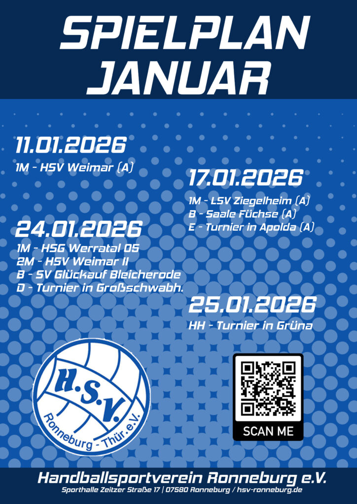 Vorschau Spielpläne der Saison 2025/2026 Alle aktuellen Spielpläne findet ihr hier: 1. Männer:Oberliga Thüringen gesamt // nur HSV Ronneburg 2. Männer:Regionsoberliga Staffel 1 gesamt // nur HSV Ronneburg B-Jugend:Oberliga Thüringen gesamt // nur HSV Ronneburg D-Jugend:Vorrunde gJD gesamt // nur HSV Ronneburg E-Jugend:Vorrunde gJE ST3 gesamt // nur HSV Ronneburg